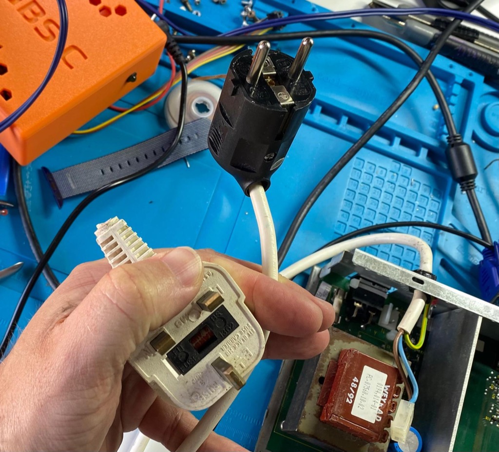 I can’t do much with British power plugs in my country. I clipped it from the cord and replaced it with the very European Schuko one.