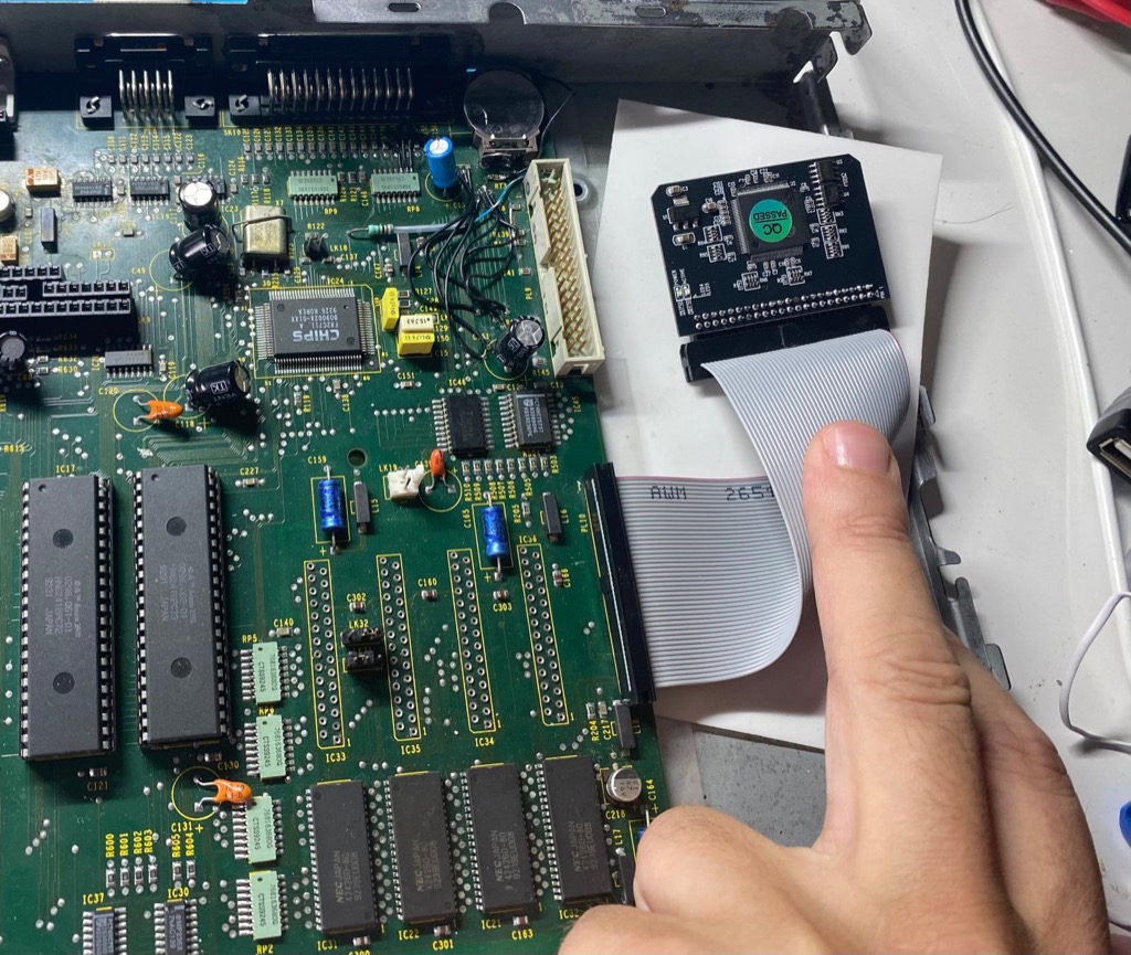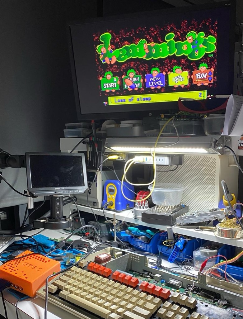 I then go to arcarc.nl, download the ADF floppy image for the Lemmings port for the A3020, and copy the file to the root of the USB stick. Finally, I connect the Gotek to the A3020 board, insert the USB stick, and turn the machine on.