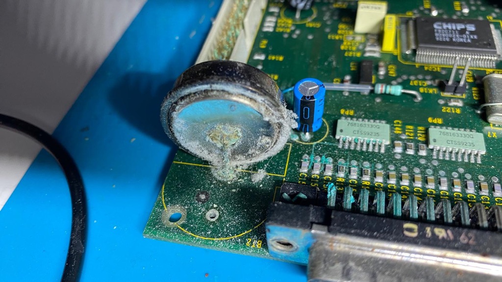 😱 Doesn’t look good at all. There’s corrosive material all over the place, especially near the battery. It may have damaged the PCB and possibly more. So, what I have to do right away is remove the battery and give the PCB a good and prolonged bath with vinegar to neutralize the alkaline electrolyte.