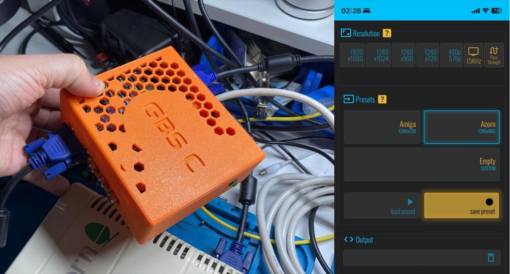 Luckily, I do have a GBS-8220 upscaler with GBS-control, which I discussed in another blog post. The GBS can take 15-KHz VGA resolutions as input and scale them to 31-KHz with very low latency. I created a profile for the A3020, tweaked a few settings, and got it to work perfectly.