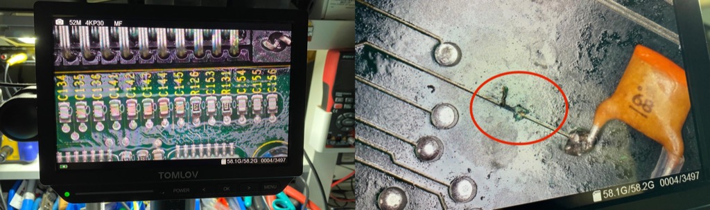Battery leaks can be hazardous; they often damage items that are far from the battery and not visible to the naked eye. Sure enough, with the help of the multimeter and the microscope, I found plenty of broken traces, more than I would imagine. Look at this broken track on the back of the PCB.