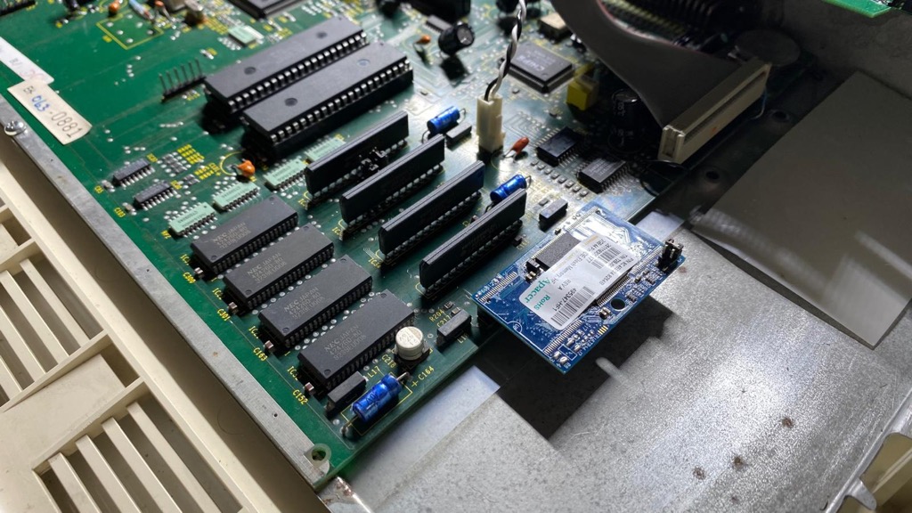 In retro-computing, CF cards are the default IDE disk replacement; their interface is electrically identical to the ATA (Advanced Technology Attachment) interface, and all that is needed is a physical connector adapter. I try various CF cards that I have lying around until I find one that the controller recognizes (most of the time).