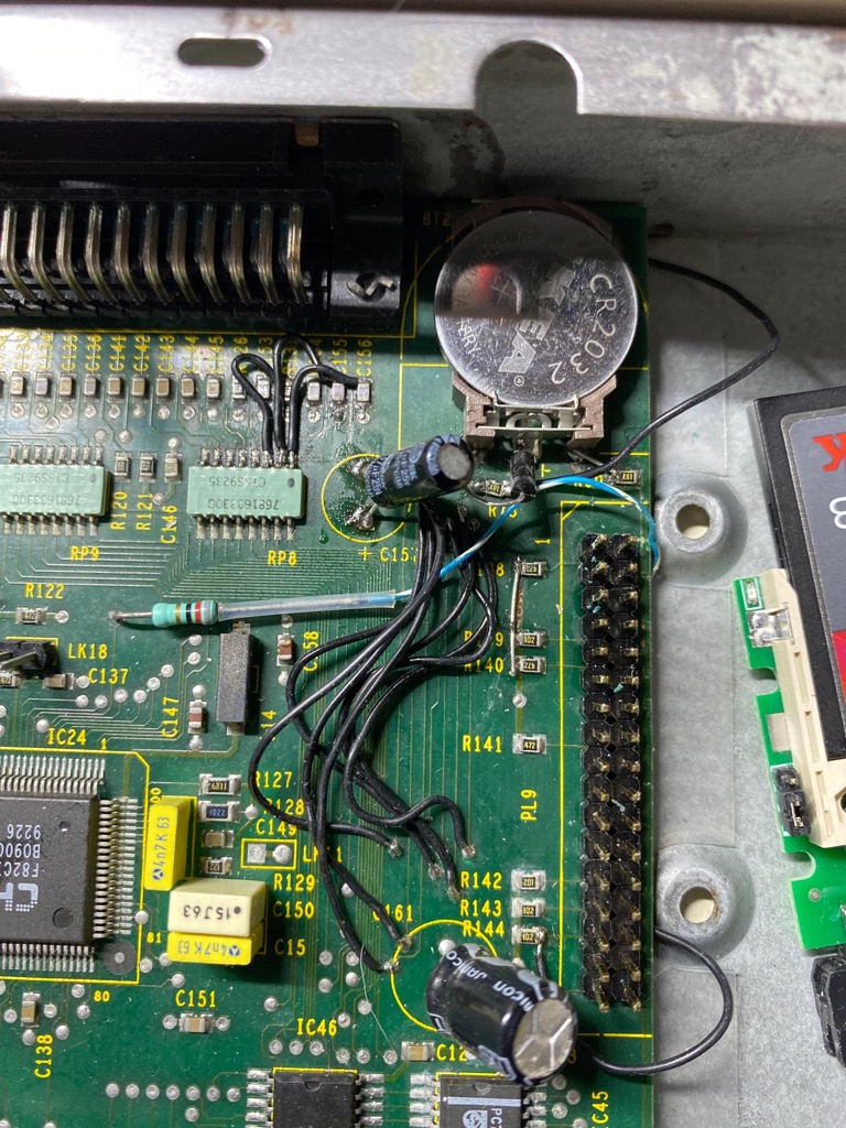 To fix the corroded traces, I used bodge jumpers. I also replaced the original battery with a CR2032 battery holder and the floppy drive connector. The result isn’t pretty, but it works.