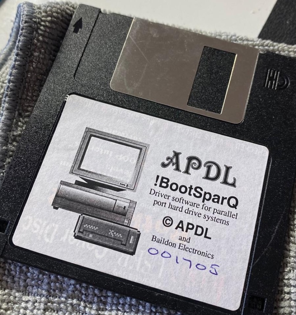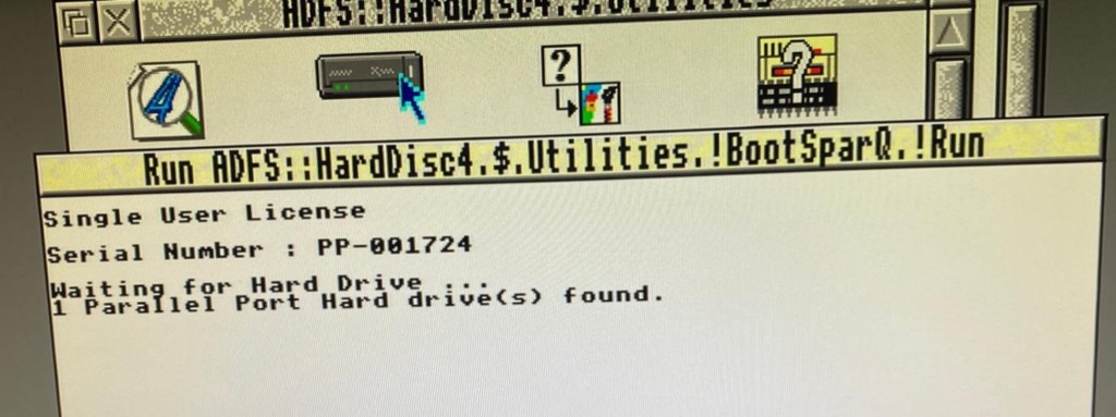 The Acorn Archimedes and RISC OS didn’t support theses drives natively, so in order to get them to work we need a special comercial driver called !BootSparQ developed by APDL, most commonly referred to the Archimedes Public Domain Library. I couldn’t find a copy of the driver online to download.