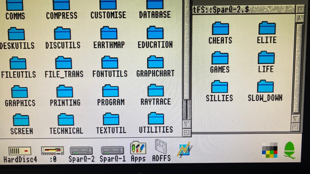 And a few seconds later, RISC OS adds two new disk partitions, SparQ-1 and SparQ-2, that I can browse and run software from. The disk is indeed loaded with software and games. Nice.