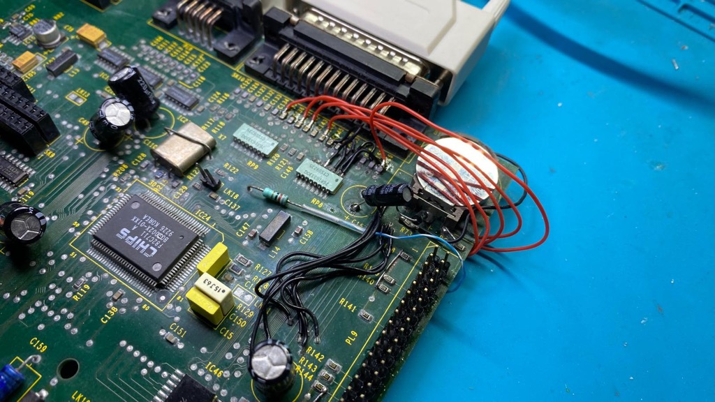 Without surprise, I found more broken traces on the back side of the motherboard. It’s remarkable how much damage a leaking battery can cause. I soldered a few more bodge wires to fix the issues and got the parallel port working.