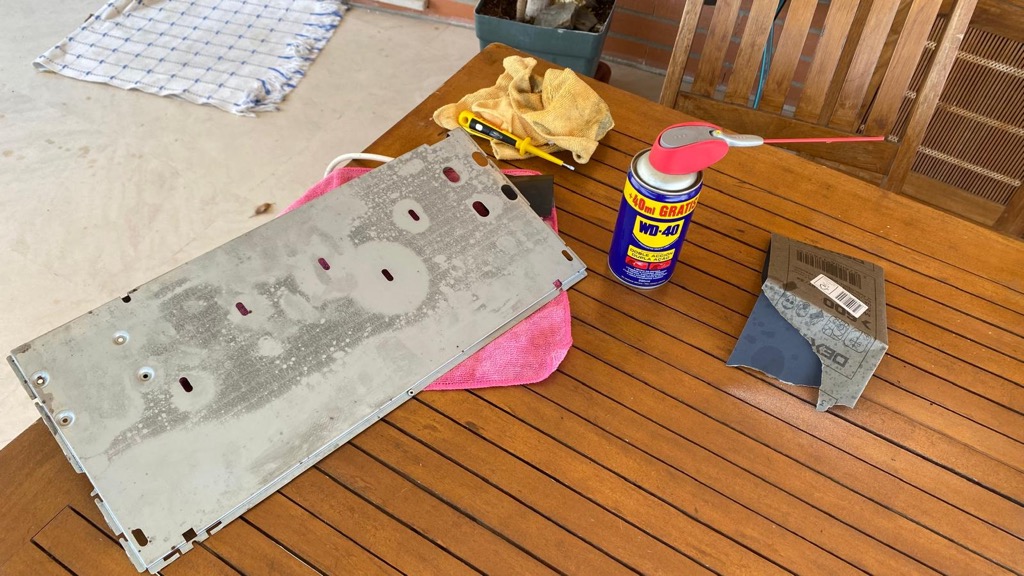 Next, I cleaned the oxidized metal case and other metal plates with WD-40 and sandpaper.
