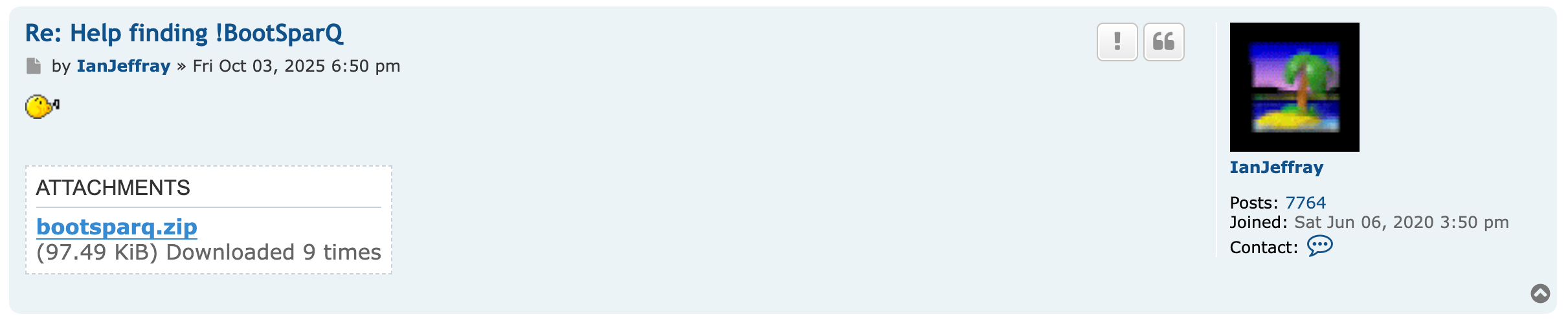 However, another thing happened in parallel. Remember the wonderful Stardot forum I mentioned before? A few days earlier, I posted a question about whether someone could get me the !BootSparQ floppy. This community is so amazing. Ian Jeffray, the person behind multiple RISC OS software tools and hardware projects for the Acorns, replied to my question and provided me with the dump of the floppy in the forum.