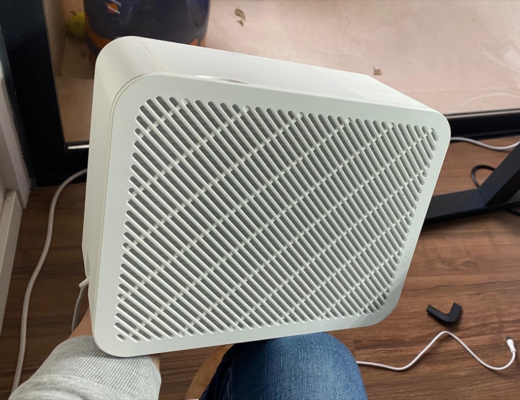And this is the final result, an air purifier on the floor with a flexible hose that I can easily move around the table when I need it.
