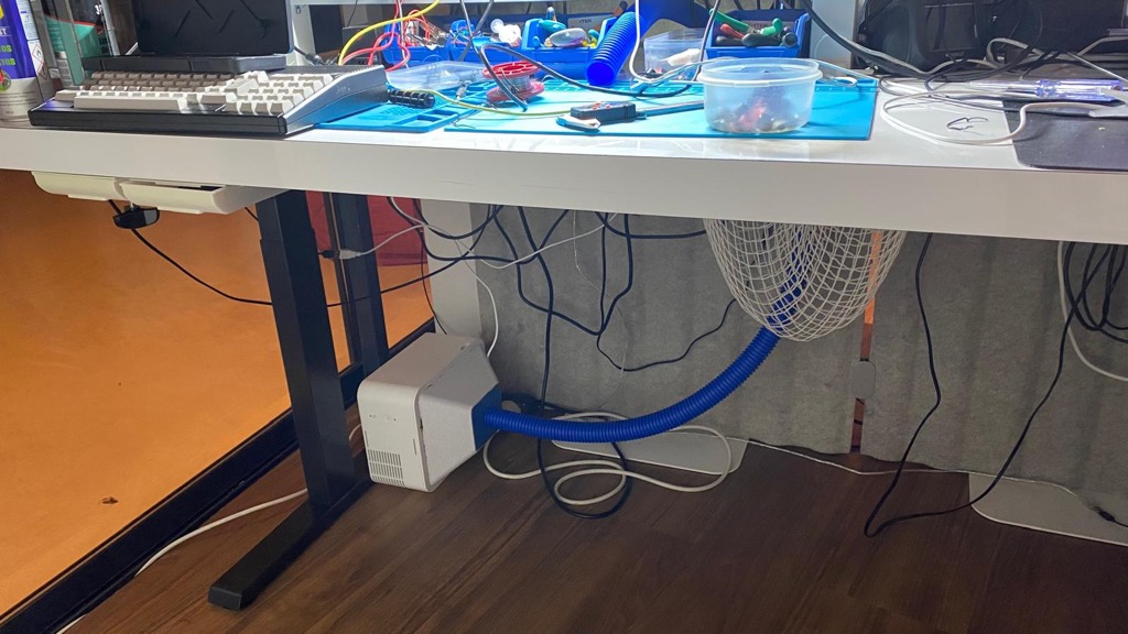 Next up, I want the air purifier on the floor, not on the table, and a long, flexible hose I can pull to the table when I need it for soldering.